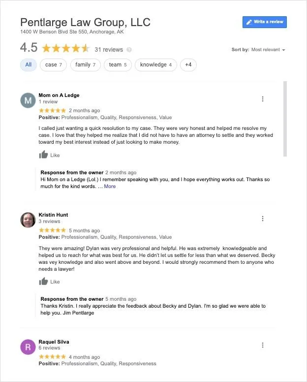 At Pentlarge Law Group, LLC, we are proud of our reputation for honest and ethical representation. If you or a family member is injured, we will give you straight answers and a truthful assessment of your claim.